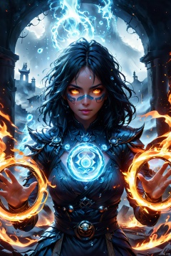 Spell rings   Mortal Kombat style, wounded defeated woman kitana fire spell rings, circular glowing rings in each hand, multiple spell rings, silver eyes, European appearance, face mask, warrior, weapons, thriller, sweat droplets, sweaty, cinematic location, battle, scorched battlefield, mist, Spell rings