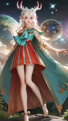 1girl,solo,antlers,pointy ears,white hair,dress,jewelry,anklet,long hair,looking at viewer,capelet,bow,<lora:瑶妹:0.75>,scenery,starry_sky,stars,sky,see-through,barefoot,