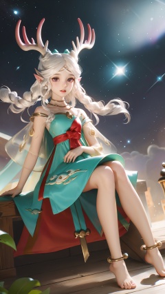 1girl,solo,antlers,pointy ears,white hair,dress,jewelry,anklet,long hair,looking at viewer,capelet,bow,<lora:瑶妹:0.75>,scenery,starry_sky,stars,sky,see-through,barefoot,sitting,