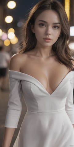((Realistic lighting, Best quality, 8K, Masterpiece: 1.3)), Focus: 1.2, 1girl, Perfect Figure: 1.4, Slim Abs: 1.1, ((Dark brown hair)), (White dress: 1.4), (Outdoor, Night: 1.1), City streets, Super fine face, Fine eyes, Double eyelids,