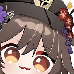 close-up, 1girl, hu tao \(genshin impact\), hat, solo, looking at viewer, hat flower, flower, simple background, brown hair, bangs, :3, red eyes, white background, chibi, hair between eyes, symbol-shaped pupils, long hair, portrait, hat ornament, smile, black headwear