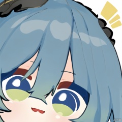 close-up, 1girl, solo, bangs, looking at viewer, yellow eyes, hair between eyes, smile, blue hair, open mouth, simple background, portrait, white background, chibi