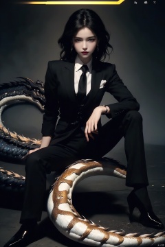 ((((dramatic))), (((gritty))), (((intense))) film poster featuring a A mature face as the central character. She stands confidently in the center of the poster, A mature face, wearing a stylish and edgy outfit, with a determined expression on her face. The background is dark and gritty, with a sense of danger and intensity. The text is bold and attention-grabbing, with a catchy tagline that adds to the overall feeling of drama and excitement. The color palette is mainly dark with splashes of vibrant colors, giving the poster a dynamic and visually striking appearance,tachi-e (magazine:1.3), (cover-style:1.3), fashionable, vibrant, outfit, posing, front, colorful, solo, looking at viewer, shirt,1girl, (eastern dragon:1.5),white shirt,necktie, collared shirt, pants, black pants, formal, suit, black necktie, watch, wristwatch, black suit, full body,(long legs:1.2),Visual impact,A shot with tension,(upper body:1.0), sideways glance,cold attitude, Ear stud,tattoo,