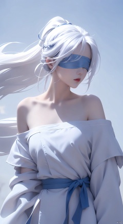 duotone white and blue,1girl,Long hair, ponytail, white hair,(blindfold),The wind blows, close-up,Off Shoulder