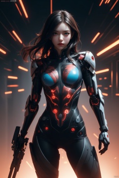 1girl, perky breasts, (surrounded by rotating transparent red scrolls, floating transparent red Chinese characters, dynamic, rotating), standing in the air, not looking at the camera, writing calligraphy, solo, blue eyes, holding, weapon, (holding weapon, neon, glowing, robot, mecha), cyberpunk, open_hand, v-fin, movie lighting, strong contrast, high level of detail, best quality, masterpiece, female venom, perfect body, slender figure, bailing_glitch_effect,