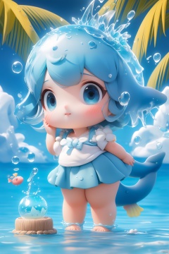(masterpiece), (best quality), Exquisite visuals, high-definition, (ultra detailed), finely detail, Kawai, loveliness, standing, ((full body)), a slightly shy loli with short blue hair,anthropomorphic whale,a center cut, (child:1.2),whale clothing,blue skirt,(((spray water on the head, there is a water column on the head))),there are many colorful bubbles around,melting clothes, clothes made of water,whale tail,The environment is next to the beach, with coconut trees and many seashells on the beach,, ty-hd<lora:EMS-262746-EMS:0.500000>