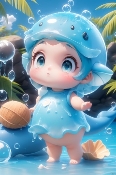 (masterpiece), (best quality), Exquisite visuals, high-definition, (ultra detailed), finely detail, Kawai, loveliness, standing, ((full body)), a slightly shy loli with short blue hair,anthropomorphic whale,a center cut, (child:1.2),whale clothing,blue skirt,(((spray water on the head, there is a water column on the head))),there are many colorful bubbles around,melting clothes, clothes made of water,whale tail,The environment is next to the beach, with coconut trees and many seashells on the beach<lora:EMS-262746-EMS:0.500000>