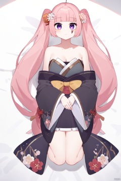 solo, kimono costume, pink hair, purple eyes, very long twintails, bare shoulders, cleavage, hair flower, focus on face, depth of field, full body, lying on bed, from above