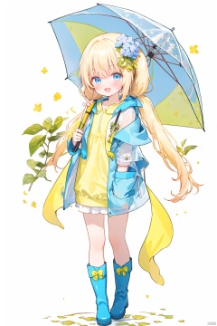 1girl,rainbow,raincoat,yellow raincoat,rubber boots,hydrangea,flower,long hair,twintails,boots,blush,umbrella,open mouth,hair ornament,white background,hood,solo,teruterubouzu,very long hair,hood up,long sleeves,low twintails,bow,bangs,smile,animal hood,blue eyes,rabbit,closed umbrella,puddle,full body,:d,snail,yellow footwear,simple background,pink flower,standing,leaf umbrella,holding umbrella,food-themed hair ornament,hair bow,animal ears,holding,blonde hair,hair flower,rain,animal,clpstyle,cuteloli