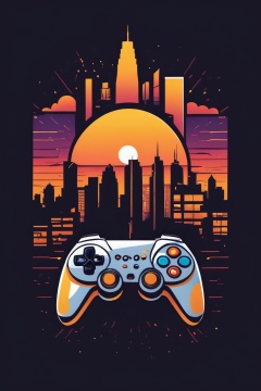 (best quality, 4k, 8k, highres, masterpiece:1.2), ultra-detailed,T-shirt design,illustration, a poster of a video game controller in front of a city skyline with a sunset,vector illustration,black background
