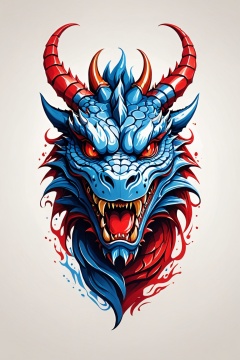(best quality, 4k, 8k, highres, masterpiece:1.2), ultra-detailed,T-shirt design,illustration, a dragon with a red and blue face and horns on it's head and a red and blue face,vector illustration,white background