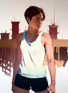 1girl, solo, short hair, simple background, brown hair, white background, brown eyes, shorts, **** top,<lora:SD1.5_Nianhua2:0.8>