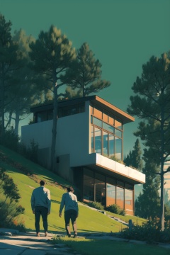 tree, grass, outdoors, solo, shirt, pants, orange shirt, 1boy, shadow, plant, standing, black hair, male focus, long sleeves, from behind, ponytail, wide shot, building, bush