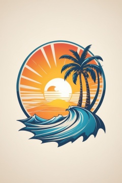 (best quality, 4k, 8k, highres, masterpiece:1.2), ultra-detailed,T-shirt design,illustration, a palm tree with a wave coming in front of it and a sun behind it,vector illustration,white background