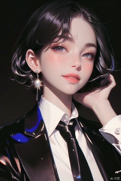 xingganOR\(ip\), solo, 1girl, shirt, Black coat, black tie, white base shirt,collared shirt, short hair, necktie, parted lips, black necktie, white shirt, earrings, jewelry, portrait, looking at viewer