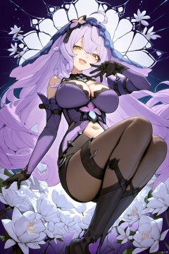 score_9, score_8_up, score_7_up, score_6_up, score_5_up, score_4_up, best quality,masterpiece,4k,very aesthetic,uncensored,rating_explicit,rating_questionable, \\\\\\\\\nai3, 1girl, solo, ahoge, virtual youtuber, , flower, looking at viewer, open mouth, smile,bangs,:d, purple background, fang, aoche\\\\\\\\\\\\\\hte, 1girl, gloves, long hair, boots, purple hair, black gloves, veil, cleavage, pantyhose large breasts, shorts, yellow eyes<lora:EMS-313347-EMS:0.800000>
