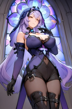 score_9, score_8_up, score_7_up, score_6_up, score_5_up, score_4_up, best quality,masterpiece,4k,very aesthetic,uncensored,rating_explicit,rating_questionable, \\\\\\\\\\\\\\\1girl,solo,in church, filled with stained glass windows, showcases depth of field and natural lighting, exuding a sense of grandeur. Standing within its hallowed halls, a woman faces the audience, her arms wide open in an embrace. The composition is symmetrical, with the woman positioned squarely at the center.,\\\\\\\\\\\\\\hte, 1girl, gloves, long hair, boots, purple hair, black gloves, veil, cleavage, pantyhose large breasts, shorts, yellow eyes<lora:EMS-290656-EMS:0.400000>, <lora:EMS-313347-EMS:0.800000>