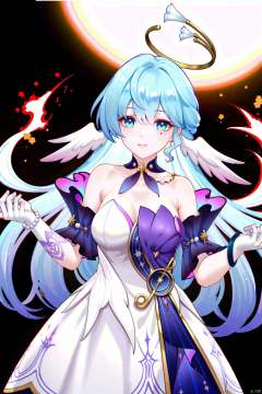 DSLR, (Good structure), HDR, UHD, 8K, 1girl,Bangs, chest, necklace,floating hair, jewelry,very long hair,Looking at the observer, parted lips, pierced,energy,electricity,magic,sssr,blonde hair, Detail, eluosi, large breasts, yinyou,Devil, ////zgn,1girl,long hair,halo,blue eyes,gloves,bangs,white dress,bare shoulders,blue hair,blue footwear<lora:EMS-310429-EMS:0.800000>