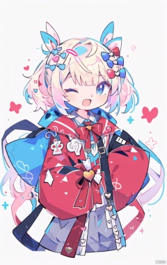 1girl, solo, long hair, looking at viewer, open mouth, bangs, blue eyes, blonde hair, shirt, hair ornament, long sleeves, bow, ribbon, blue hair, jacket, upper body, pink hair, hair bow, heart, multicolored hair, one eye closed, bowtie, red bow, sleeves past wrists, neck ribbon, pink bow, multiple hair bows, quad tails
