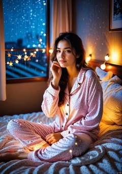Rainy day, night, A girl, Wear cute pajamas, Lying in bed., Quiet nights, Lovely bedroom style, Warm, Star lights, Film texture, Like a picture.