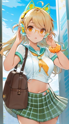 (best quality), ((masterpiece)), (highres), illustration, original, extremely detailed, <lora:ACG ART_Vl:0.7>1girl, solo, skirt, headphones, cat ear headphones, long hair, animal ear headphones, bag, pleated skirt, scrunchie, glasses, midriff, school uniform, blonde hair, fake animal ears, crop top, orange eyes, serafuku, neckerchief, animal ears, navel, short sleeves, looking at viewer, plaid skirt, shirt, plaid, wrist scrunchie, see-through, cowboy shot, breasts, miniskirt, underwear, bra, white shirt, sailor collar, medium breasts, ahoge, parted lips, hands up, :o, standing, white bra
