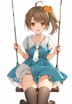 (best quality), ((masterpiece)), (highres), illustration, original, extremely detailed, <lora:ACG ART_Vl:0.7>solo, swing, 1girl, hair ornament, dress, smile, blue dress, blush, thighhighs, looking at viewer, shoes, underwear, open mouth, side ponytail, short sleeves, white background, collarbone, puffy sleeves, necktie, bangs, brown hair, white necktie, :d, puffy short sleeves, hairclip, flower, x hair ornament, orange eyes, brown footwear, loafers, simple background, hair flower, ahoge, black thighhighs