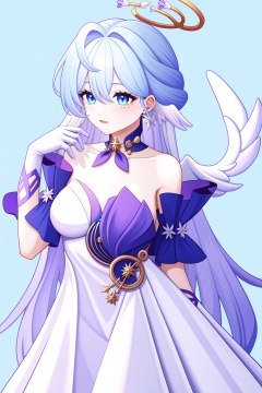 <lora:nai画风:0.0:lbw=paint>,<lora:知更鸟v6:1:lbw=char>,robin,1girl,(blue hair:1.2),bare shoulders,halo,white gloves,earrings,white dress,strapless dress,head wings,high quality,purple dress,detached sleeves,collarbone,(virtual youtuber:0),, (masterpiece,best quality,high quality:1.4),absurdres,
