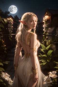 masterpiece, official art, extremely detailed cg unity 8k wallpaper, highly detailed, absurdres, 8k resolution,1girl, solo, pointy ears, elf, long hair, moon, jewelry, earrings, white hair, ass, bridal gauntlets, dress, breasts, full moon, from behind, flower, standing, white dress, night, plant, looking back,depth of field, panorama, cinematic lighting, ray tracing, best quality