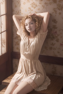 cinematic_angle, This is a photograph of a woman lying on a wooden table with a wallpaper with a floral pattern on the background. Women have fluffy and curly hair and wear a light-colored dress with lace details on the skirt. Her legs are outstretched, her toes are pointing to the sky, one hand is supporting her head, and the other is resting on the table. The whole scene has a retro and romantic feel to it.