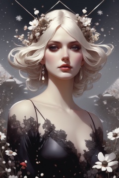 a painting of a woman with flowers on her head, concept art, by Jason Teraoka, portrait of emma frost, earrings, wyeth, white fractals, ladybugs, aerial illustration, graphic detail, (snow), artbook artwork, editorial image, nier automata concept art, ffffound, above view,d1p5comp_style