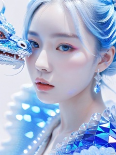 Transparent blue and white porcelain PVC skin, transparent blue and white porcelain colored skin scales, prisms, holography, color difference, fashion illustrations, masterpieces, Chinese dragon and Harajuku fashion, looking at the audience, 8k, super detailed, pixiv