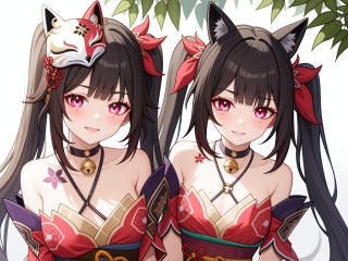 <lora:nai画风:0:lbw=paint>,<lora:花火v5:1:lbw=char>,2girls,huahuo,twintails,fox mask,red kimono,mask on head,black gloves,detached sleeves,choker,high quality,jingle bell,tattoo,( dynamic angle:1.2),(dappled sunlight on her:1.25),(Tyndall effect:1.1),light on face,hdr,bloom,An epic scene,best light,best illustration,looking at viewer,, (masterpiece,best quality,high quality:1.4),absurdres,