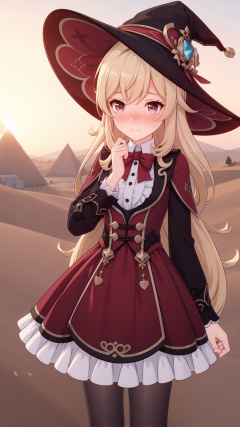(Nose blush:1.3), (embarrassed:1.3), masterpiece, best quality, Blonde, red dress, witch hat, frills, stockings, cute, <lora:yutamix-extra-genshin:0.6>, yutamix-extra-genshin, Desert, pyramid, Supr small breast, Close up, Long skirt dress, (Circle skirt:1.2), (ruffles:1.0)