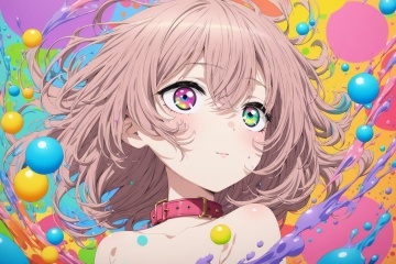 masterpiece,bestquality,4k,<lora:inui_sajuna:0.8>, inui sajuna,(pink hair:1.2),(((masterpiece))),(((best quality))),((ultra-detailed)),(illustration),(dynamic angle),((floating)),(paint),((disheveled hair)),(solo),(1girl), loli, ((small_breasts)), (((detailed anima face))),((beautiful detailed face)),collar,bare shoulders,white hair, ((colorful hair)),((streaked hair)),beautiful detailed eyes,(Gradient color eyes),(((colorful eyes))),(((colorful background))),(((high saturation))),(((surrounded by colorful splashes))),(((surrounded by colorful dot))),colorful bubble,((shining))