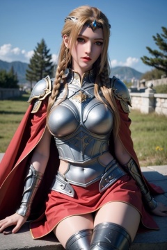 ultra realistic 8k cg,picture-perfect face,perfect face,beautiful face,masterpiece,fantasy,detailed background,realistic,perfect female body,curvy body,1girl,solo,cape,long hair,sky,full body,sitting,black stockings,<lora:tianshiyan ji_20231028224811:0.5>,armor,((red skirt)),outdoors,blond,thin legs,
