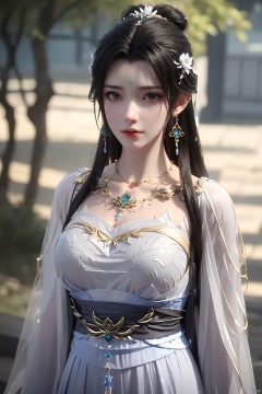 1girl, jewelry, dress, earrings, hair ornament, long hair, necklace, black hair, solo, white dress, hair bun, chinese clothes, blurry background, upper body, forehead mark, expressionless, long sleeves, sash, looking at viewer, facial mark, closed mouth, qingyi<lora:EMS-320550-EMS:0.800000>