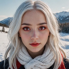 girl with white hair and bright red eyes looking at viewer, snowy landscape, close up, 8k, uhd, masterpiece,