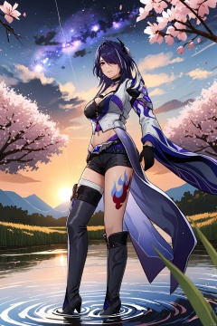 ((best quality)),((masterpiece)),((ultra-detailed)),(illustration),(detailed light),(an extremely delicate and beautiful),\\\\\\\\\\1girl play in water,happy\\\\\\\((trim)), incredibly_absurdres,(ray tracing),((lens 135mm,f1.8)),(summer),((sunset)), ((Movie Poster)),(signature),(English text:1.2),(Galaxy),(Streams),((mountain)),(cloud),((wetland)),((Cherry blossom tree)),(((border))),((frame):1.15), masterpiece,best quality,highres,////////////////////////// hquan,def clothe,1girl,long hair,purple eyes,shorts,purple hair,hair over one eye,breasts,boots,black gloves,cleavage,raiden mei,navel,tattoo<lora:EMS-313055-EMS:0.800000>