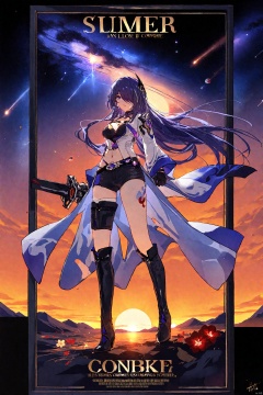 ((best quality)),((masterpiece)),((ultra-detailed)),(illustration),(detailed light),(an extremely delicate and beautiful),\\\\\\\\\\1girl ,fighting,Fighting girl, detailed eyes, holding taichi, flying drops of blood, but all, dim background, Equinox flower, Equinox flower field,\\\\\\\((trim)), incredibly_absurdres,(ray tracing),((lens 135mm,f1.8)),(summer),((sunset)), ((Movie Poster)),(signature),(English text:1.2),(Galaxy),(((border))),((frame):1.15), masterpiece,best quality,highres,////////////////////////// hquan,def clothe,1girl,long hair,purple eyes,shorts,purple hair,hair over one eye,breasts,boots,black gloves,cleavage,raiden mei,navel,tattoo<lora:EMS-313055-EMS:0.800000>
