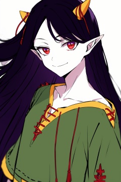 masterpiece, best quality,   <lora:NippakuZanmu:1>horns, red eyes, solo, black hair, long hair, pointy ears, smile, colored skin, white background, looking at viewer, pale skin, simple background, male focus, 1boy, purple hair