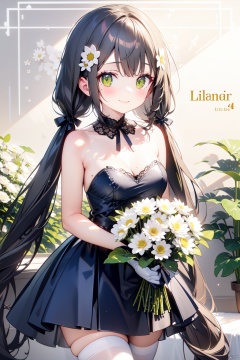 1girl, bangs, bare_shoulders, blue_dress, bouquet, breasts, character_name, cleavage, closed_mouth, daisy, dress, eyebrows_visible_through_hair, floral_background, flower, gloves, green_eyes, hair_ornament, hk416_\(girls'_frontline\), holding_bouquet, holding_flower, lily_\(flower\), lily_of_the_valley, lily_pad, long_hair, looking_at_viewer, lotus, low_twintails, mole, multi-tied_hair, ribbon, smile, solo, strapless_dress, thighhighs, vase, very_long_hair, white_flower, white_rose