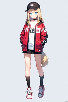 1girl, animal_ears, baseball_cap, black_legwear, blonde_hair, blue_eyes, choker, closed_mouth, collar, dog_tail, full_body, hand_in_pocket, hat, hat_with_ears, hood, hoodie, jacket, long_hair, long_sleeves, looking_at_viewer, nail_polish, open_clothes, open_jacket, red_footwear, red_nails, shoes, simple_background, smile, sneakers, socks, solo, standing, tail, virtual_youtuber, white_background