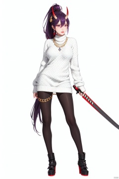 Realistic style, cinematic work, 8K wallpaper, masterpiece, very realistic quality, best quality, masterpiece, high-level, high-resolution,,,Edge lighting, dual tone lighting, soft lighting, The illuminated surface of the material has bright spots and highlights, which flicker and have a mirror effect when reflected, There are sparkling spots on the armor,,,1 girl, mature female, solo, (full body:1.5), looking at viewer, lace, strong rim light, Standard proportion of female body, golden proportion of female body,,,Standing, standing posture, Sexy full body standing posture,,,,(chuyun, 1girl, horns, oni horns, long hair, purple hair, ponytail, bangs, hair between eyes, red eyes, purple eyes, (weapon, sword, katana, turret, rigging, cannon, machinery),:1.2),,,(Medium length white fluffy sweater:1.5),colorful,(detailed skin: 1.3), (detailed face: 1.3),clear focus,delicate,(mature women: 1.2),(glossy skin+glossy skin: 1.4),(sweating: 1.1),(big_eyes),red_ eyeshadow,long_ Eyelashes, red lips,,,simple background, grey background,,,(Diamond hair accessories, diamond necklaces, diamond earrings, diamond earrings, clothes embedded with diamonds, armor embedded with diamonds,:1.3),, , aerhangeersike, daiduo, chuyun, chuyun<lora:EMS-318967-EMS:0.350000>, <lora:EMS-320605-EMS:0.200000>