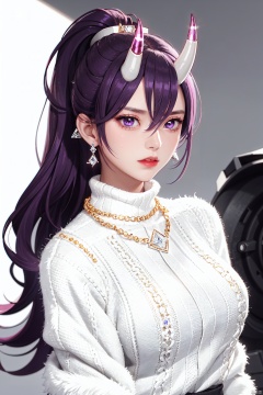 Realistic style, cinematic work, 8K wallpaper, masterpiece, very realistic quality, best quality, masterpiece, high-level, high-resolution,,,Edge lighting, dual tone lighting, soft lighting, The illuminated surface of the material has bright spots and highlights, which flicker and have a mirror effect when reflected, There are sparkling spots on the armor,,,1 girl, mature female, solo, full body, looking at viewer, lace, strong rim light, Standard proportion of female body, golden proportion of female body,,,Standing, standing posture, Sexy full body standing posture,,,,(chuyun, 1girl, horns, oni horns, long hair, purple hair, ponytail, bangs, hair between eyes, red eyes, purple eyes, Rigging, turret, cannon, chain, mech, anchor,,, :1.2),,,(Medium length white fluffy sweater:1.5),colorful,(detailed skin: 1.3), (detailed face: 1.3),clear focus,delicate,(mature women: 1.2),(glossy skin+glossy skin: 1.4),(sweating: 1.1),(big_eyes),red_ eyeshadow,long_ Eyelashes, red lips,,,simple background, grey background,,,(Diamond hair accessories, diamond necklaces, diamond earrings, diamond earrings, clothes embedded with diamonds, armor embedded with diamonds,:1.3),, , aerhangeersike, daiduo, chuyun, chuyun<lora:EMS-318967-EMS:0.300000>, <lora:EMS-320605-EMS:0.150000>