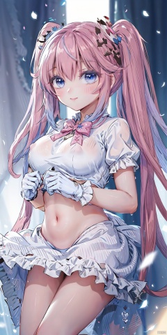 1girl, solo, long hair, breasts, looking at viewer, blush, smile, bangs, blue eyes, large breasts, gloves, dress, bow, ribbon, navel, twintails, nipples, pink hair, flower, blue hair, hair bow, heart, multicolored hair, food, clothes lift, two-tone hair, mouth hold, drill hair, lifted by self, twin drills, dress lift, chocolate, valentine, food on body, chocolate on body, chocolate on breasts