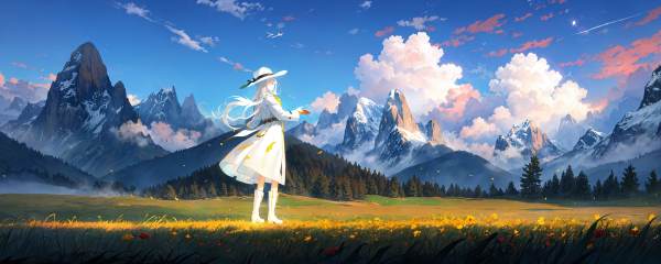 ((best quality)), ((masterpiece)), ((ultra-detailed)), (illustration), (detailed light), (an extremely delicate and beautiful),((trim)),incredibly_absurdres,(ray tracing),(Autumn),((solo:1.8)),(1girl:1.3),((a beautiful girl)),(((full body shot))),((standding)),(facing away),(+perfect hand+:1.21),(((white coat))),((beautiful white dress+white knee boots)),((Belts)),((white hat)),(white scarf),(leg loops),(((long white_hair))),((beautiful sky)),(scenery),((mountain)),(cloud),((nature)),(grass),((fog)),(pine),(flower),