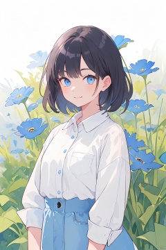 (watercolor:1.2),watercolor, 1girl, solo, flower, white background, holding, blue eyes, simple background, holding flower, blue flower, short hair, shirt, one eye covered, upper body, bob cut, long sleeves, looking at viewer, collared shirt, bangs, black hair, wide sleeves, blush, white shirt, smile, closed mouth, blue theme, short sleeves,, watercolor