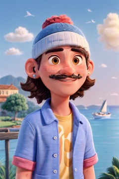 TT,  looking at viewer, yellow background, short hair, pink flower, jacket, red flower, mustache,blackeyes,blush,ligne, tree, sailing,palm tree, sky, cloud, day, ocean, outdoors, blue sky, water,hat, black hair, white shirt, earrings, 1boy, leaf, plant, shirt, flower, jewelry, beanie, solo, facial hair, male focus, upper body, cat, food, ,迪士尼