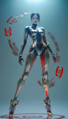 1girl,Surrounded by rotating transparent red scrolls,floating transparent red Chinese characters,dynamic,rotating,1 man standing in the air,not looking at the camera,writing calligraphy,solo,blue eyes,holding,weapon,holding weapon,glow,robot,mecha,open_hand,v-fin,movie lighting,strong contrast,high level of detail,best quality,masterpiece,female venom,perfect body,slender figure,<lora:xl-shanbailing-1213Glitch_effect:0.7>,bailing_glitch_effect,(gold:1.2),