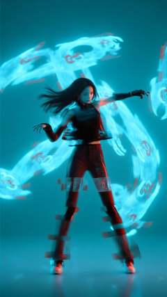 1girl,Surrounded by rotating transparent red scrolls,floating transparent red Chinese characters,dynamic,rotating,1 man standing in the air,not looking at the camera,writing calligraphy,solo,blue eyes,holding,weapon,holding weapon,glow,robot,mecha,open_hand,v-fin,movie lighting,strong contrast,high level of detail,best quality,masterpiece,female venom,perfect body,slender figure, bailing_glitch_effect